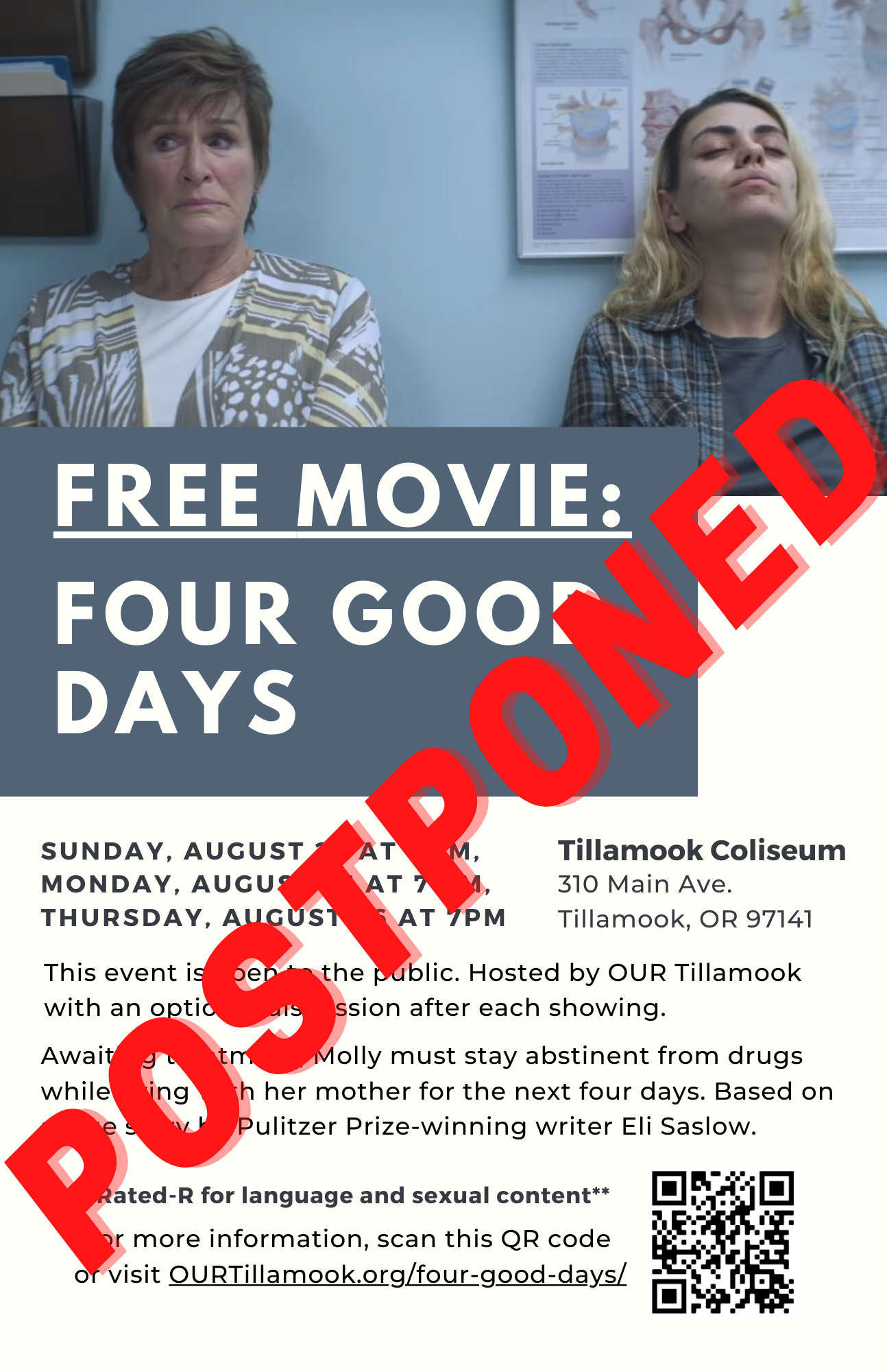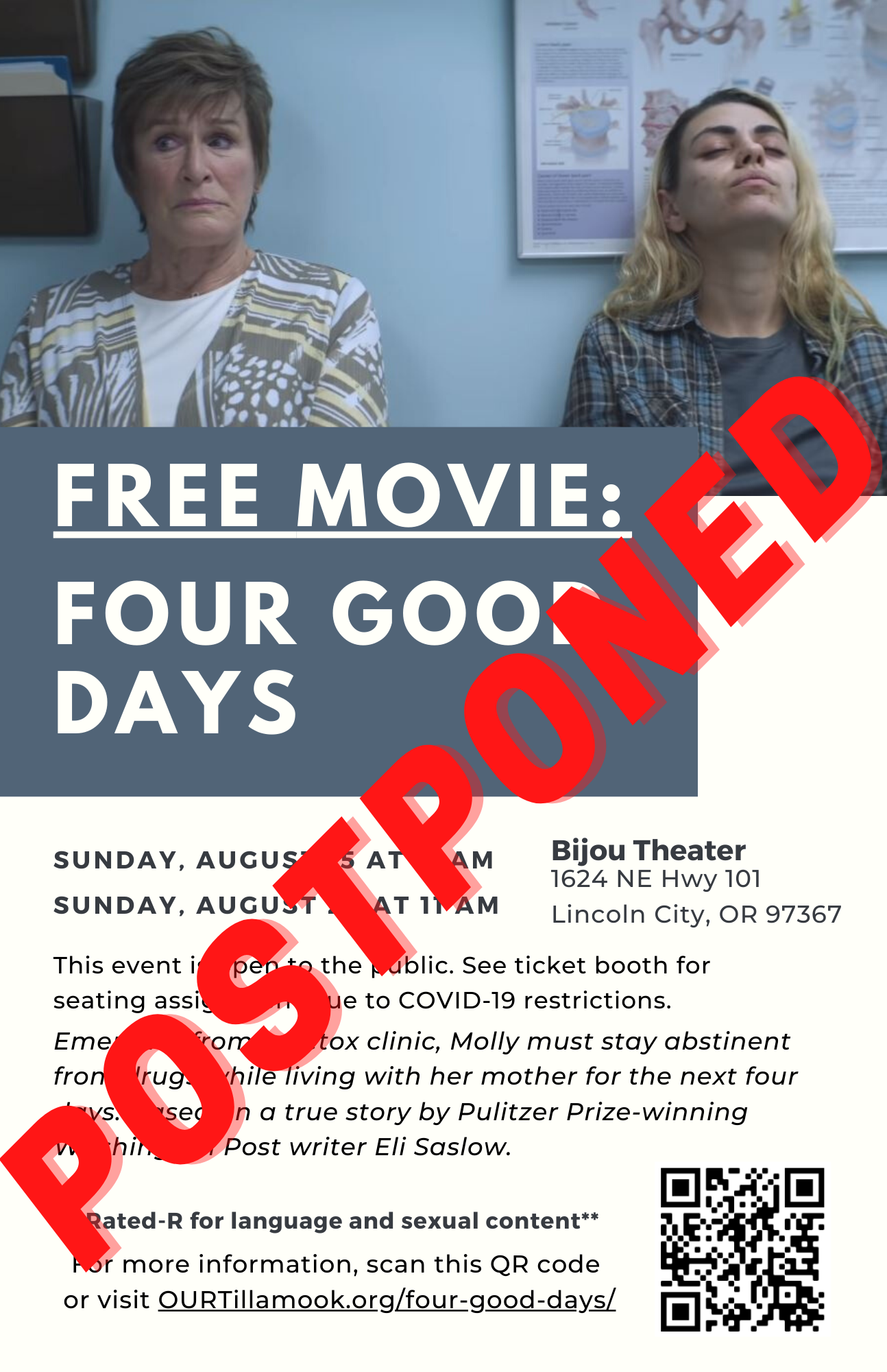 OUR Tillamook is happy to share free movie showings of Four Good Days in both Tillamook and Lincoln City. This event is open to the public and there is no registration needed to attend. Please note: this movie is rated-R for language and sexual content